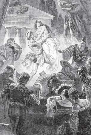 А Фауст скитается в «классической Вальпургиевой ночи», в этакой своеобразной параллели предыдущей «романтической» Вальпургиевой ночи. Если старая Вальпургиева ночь создавалась Гёте на основе народных преданий, то в классической Вальпургиевой ночи действующими лицами становятся мифические образы. Здесь, среди античных видений, Фауст стремиться встретить воплощение красоты - Прекрасную Елену.