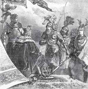 Здесь Фауст выступил в роли командующего императорскими войсками. При помощи Мефистофеля Фауст легко побеждает бунтовщиков. Иного финала быть и не могло. При всей своей прогрессивности взглядов, Гёте не был республиканцем и не мог допустить падения, пусть даже дьявольской, но императорской власти. За услуги трону, император награждает Фауста наделом земли, чисто символическим, узкой полоской полузатопленного морского берега. Но этот шаг императора вызвал неудовольствие архиепископа. Архиепископ прозорливо разгадал, что дело с победой - нечисто, что тут не обошлось без вмешательства нечистой силы. На это император с досадой ответил: «Земель ведь нет ещё. Они в пучине моря». Да, воистину «царский» подарок!
