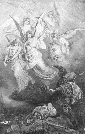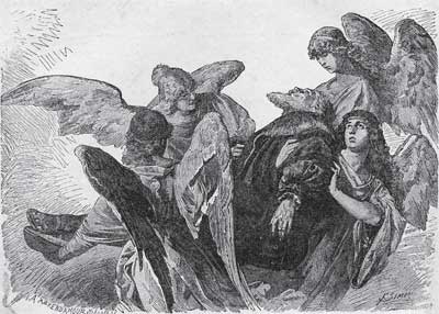 Тут с небес появляется Хор ангелов. Мефистофель и Хор ангелов ведут меж собой спор за душу Фауста. Ведь Фауст, будучи живым, добровольно подписал договор о продаже души в обмен на исполнение желаний. Мне кажется, что Мефистофель добросовестно исполнил все пункты договора. Юридически он имеет полное право на фаустову душу. Аргументы Хора ангелов сводятся к общим рассуждениям о благодати и о предназначении добра. В ходе дискуссии Мефистофель малость замешкался и Хор ангелов вмиг вознёсся в небо, прихватив с собой душу Фауста. Мефистофелю остаётся только клясть самого себя за допущенный промах.