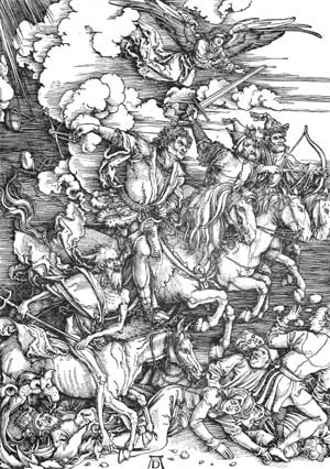 На гравюре изображены четыре всадника Апокалипсиса, совершающие четыре великие казни. Появление этих всадников знаменует снятие первых четырёх печатей с Божественной книги. «И видел я в деснице у Сидящего на престоле книгу, написанную внутри и отвне, запечатанную семью печатями» (5:1). В других переводах вышеуказанного текста сказано: «И я увидел на правой руке Того, кто сидит на престоле, свиток, исписанный внутри и на обороте, запечатанный семью печатями». В этой книге (свитке) изложено Божье намерение в отношении религии (церквей), людей, Земли и Вселенной.