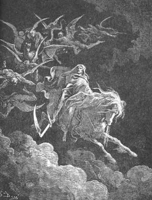 На гравюре изображён четвёртый всадник Апокалипсиса на бледном коне, символизирующий смерть. «И ад следовал за ним, и дана ему власть над четвертой частью земли - умерщвлять мечем и голодом, и мором и зверями земными» (6:8).