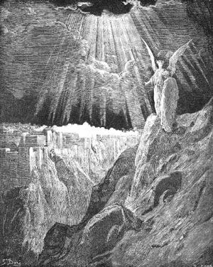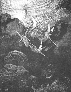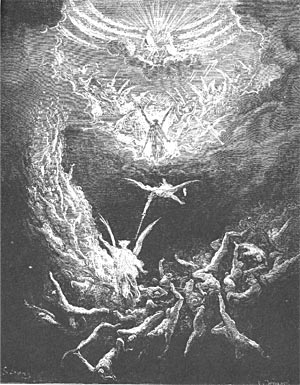 И произошла на небе война: Михаил и Ангелы его воевали против дракона, и дракон и ангелы его воевали против них, но не устояли, и не нашлось уже для них места на небе. И низвержен был великий дракон, древний змий, называемый диаволом и сатаною, обольщающий всю вселенную, низвержен на землю, и ангелы его низвержены с ним.