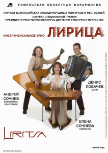 16 октября, в 19 часов на сцену Областной филармонии выйдут лауреаты международных, всероссийских и республиканских конкурсов, музыканты инструментального трио «Лирица» - обладатели специальной премии президента республики Беларусь. Трио «Лирица» выступало в лучших залах России, Литвы, Украины, Польши, Германии, Италии, Китая и Японии. В их репертуаре - известные произведения классики, танго и фольклора. Кроме того, музыканты исполнят композиции, в которых переплетаются знакомые мелодии из песен и кинофильмов, известные отрывки классических произведений.