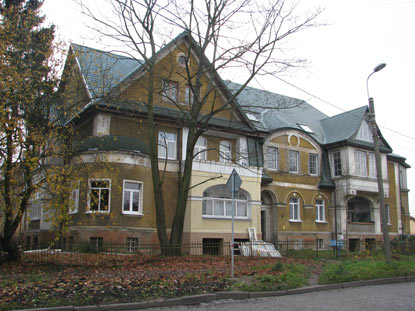 Двухэтажный угловой дом по бывшей Эрнст-Вихерт-Штрассе представляет собой здание с мансардной крышей и маленькой башней на углу, постройки приблизительно 1905 года.