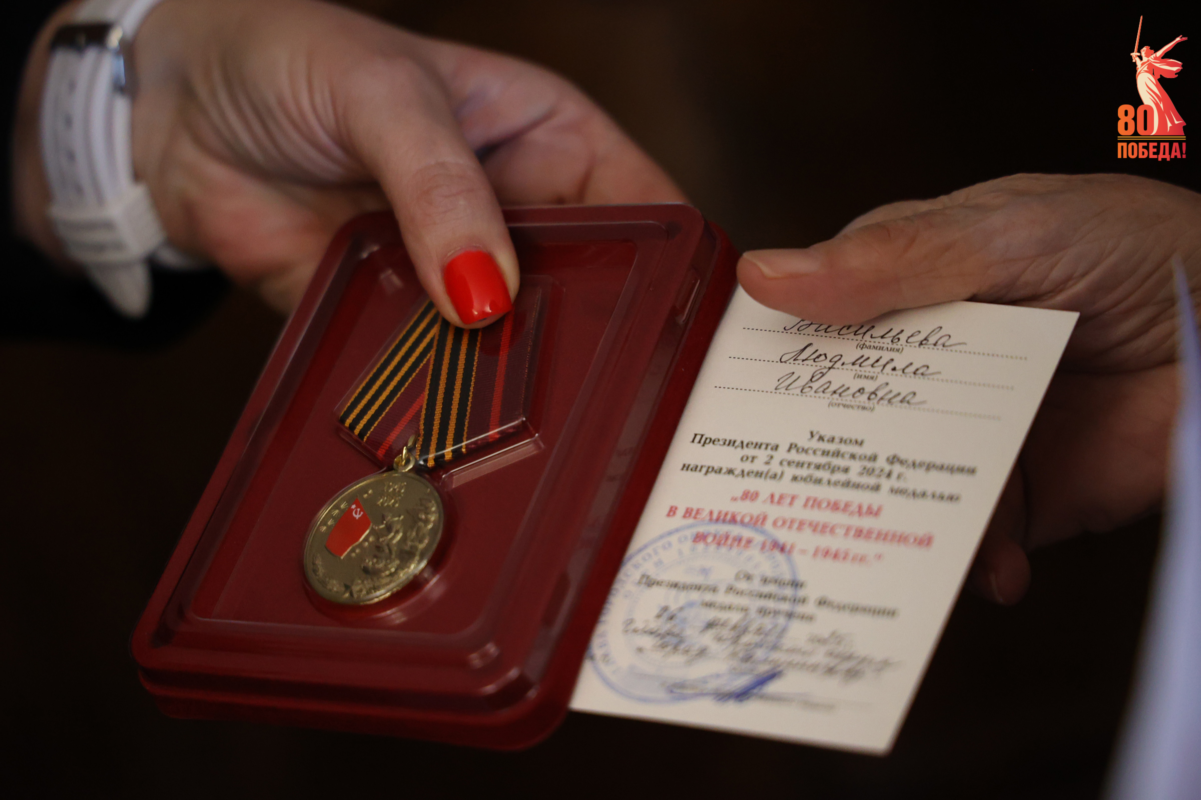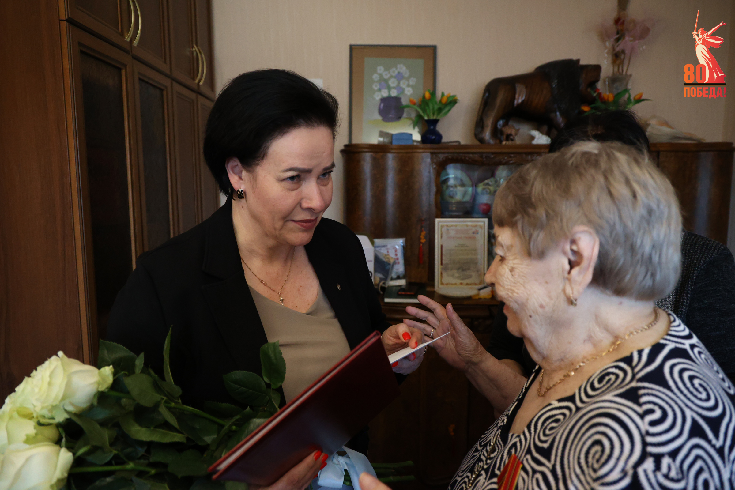 Елена Дятлова поздравила Людмилу Ивановну, поблагодарила за доблестный труд и пожелала доброго здоровья, счастья, оптимизма, долгих лет жизни, теплоты и внимания родных и близких. Она вручила именное письмо от Президента РФ, ценные подарки и юбилейную медаль Победы. В год 80-летия Победы в Великой Отечественной войне все участники и ветераны войны Указом Президента России Владимира Владимировича Путина награждены юбилейными медалями.