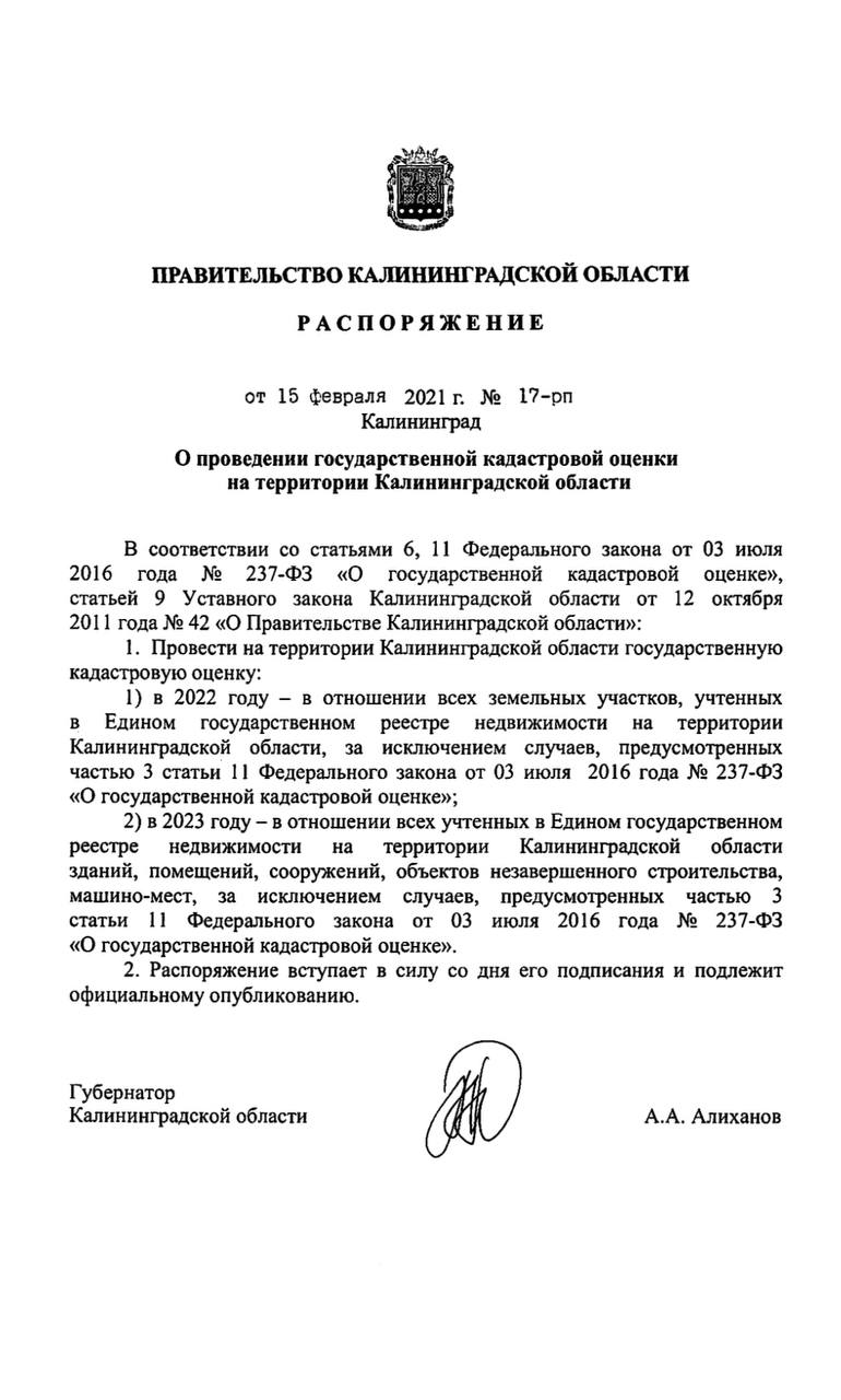 В 2023 году в соответствии с распоряжением Правительства Калининградской области от 15 февраля 2021 года № 17-рп «О проведении государственной кадастровой оценки на территории Калининградской области» в 2023 году государственным бюджетным учреждением Калининградской области «Центр кадастровой оценки и мониторинга недвижимости» (далее также – бюджетное учреждение) проведена государственная кадастровая оценка всех учтенных в Едином государственном реестре недвижимости на территории Калининградской области зданий, помещений, сооружений, объектов незавершенного строительства, машино-мест, за исключением случаев, предусмотренных частью 3 статьи 11 Федерального закона от 03 июля 2016 года № 237-ФЗ «О государственной кадастровой оценке», по состоянию на 01 января 2023 года.