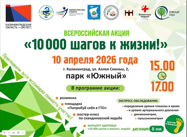 Приглашаем всех калининградцев и гостей города присоединиться к масштабному физкультурному мероприятию - Всероссийской акции «10 000 шагов к жизни», посвященной Всемирному Дню здоровья.