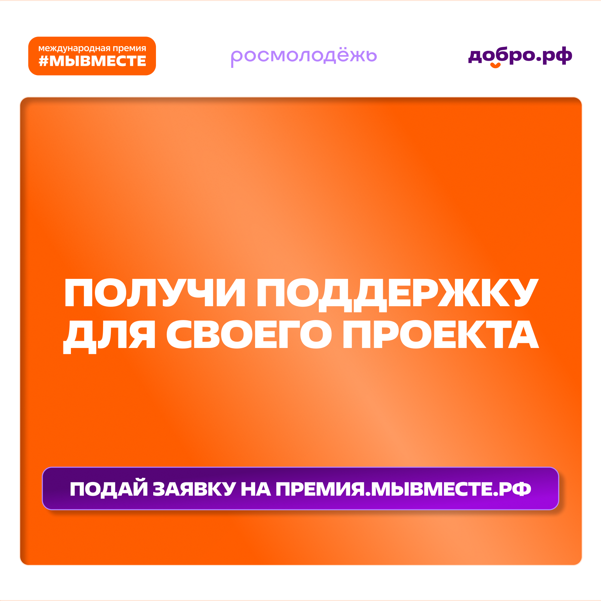 Приём заявок для участия в Международной Премии открыт на сайте премия.мывместе.рф. Премия реализуется при поддержке Президента России в рамках нацпроекта «Молодёжь и дети».