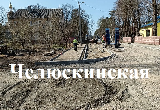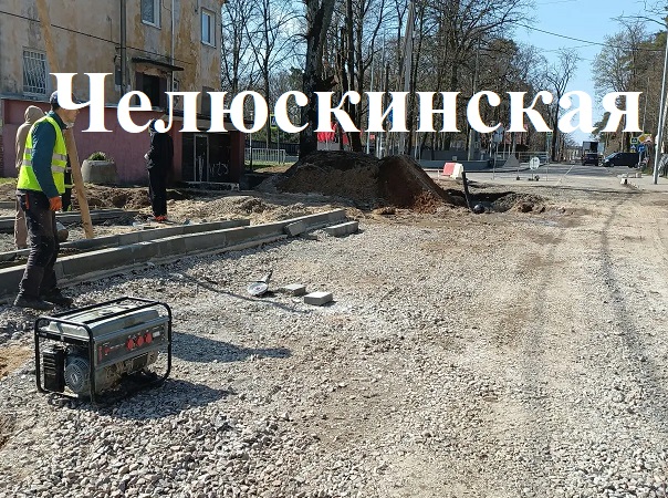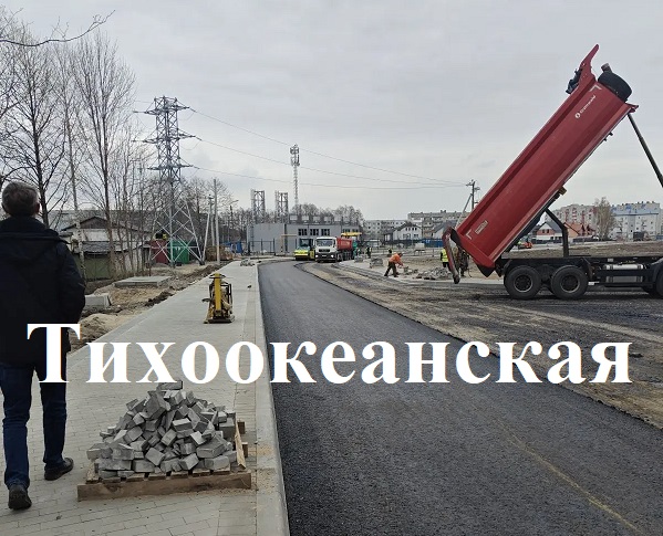 На строительстве Тихоокеанской укладывают нижний слой асфальта на дороге, мостят тротуар. На соседней Челюскинской переключают электросети, устраивают щебёночное основание, бортовой камень, фрезеруют старый асфальт.