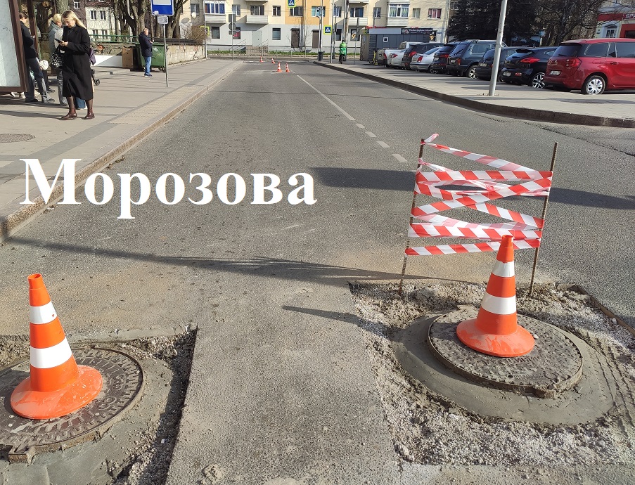 На Павлика Морозова подрядчик прошедшего здесь в 2022 году капремонта выправляет просевшие колодцы на дороге, ещё один подрядчик, также по гарантии, приводит в порядок дорогу на Псковской.