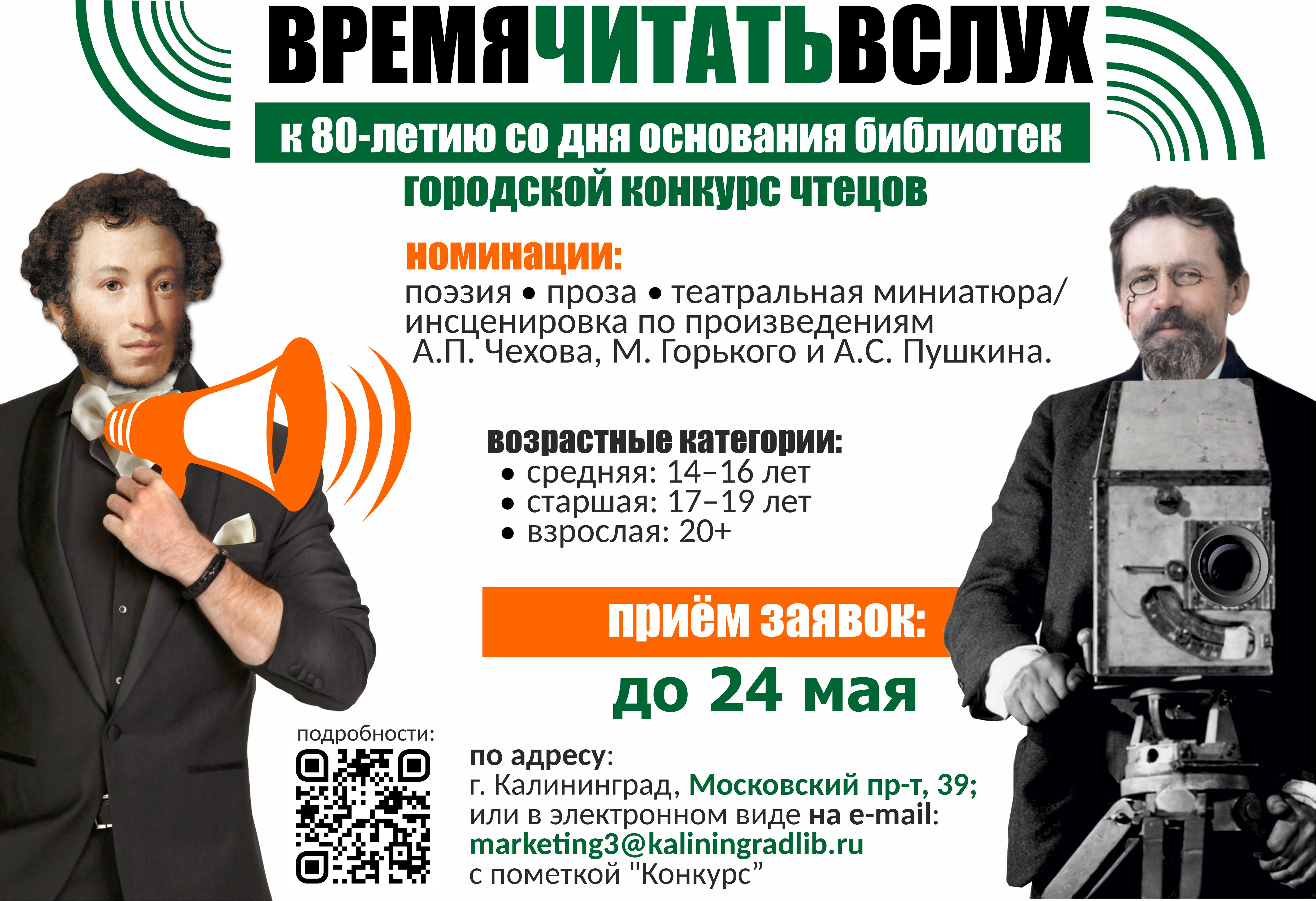 Калининградская централизованная библиотечная система приглашает жителей Калининграда и области в возрасте от 14 лет принять участие в городском конкурсе чтецов «Время читать вслух», посвящённом 80-летию со дня основания библиотек Калининграда и творчеству трёх классиков русской литературы.