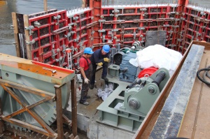 Сейчас на мосту Высоком полным ходом идет монтаж разводного механизм, который позволит поднимать части пролета для прохождения судов. На пролетных строениях ведутся сварочные работы, на подпорных стенках осуществляется армирование. Опоры моста облицовывают красным кирпичом.