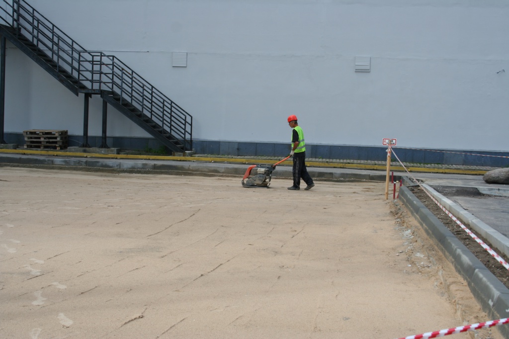 Сейчас на объекте устанавливают бортовой камень, готовят песчаное основание для укладки плитки.