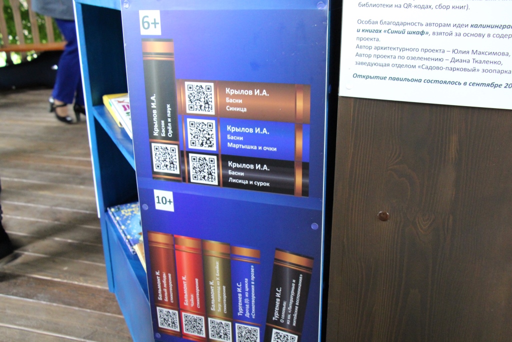 Из павильона открывается обзор на вольеры. Но главное назначение возрождённого объекта – возможность тематического чтения. Сотрудники библиотек города помогли с наполнением уже знакомого калининградцам по другим адресам «синего шкафа». Здесь представлены книги о природе и животном мире, причём не только на бумаге, но и электронные, к которым получить доступ к QR-коду. Посетители с детьми, отдыхая во время прогулок по зоопарку, смогут теперь прочитать рассказы и стихи о тех животных и птицах, которых они только что увидели.