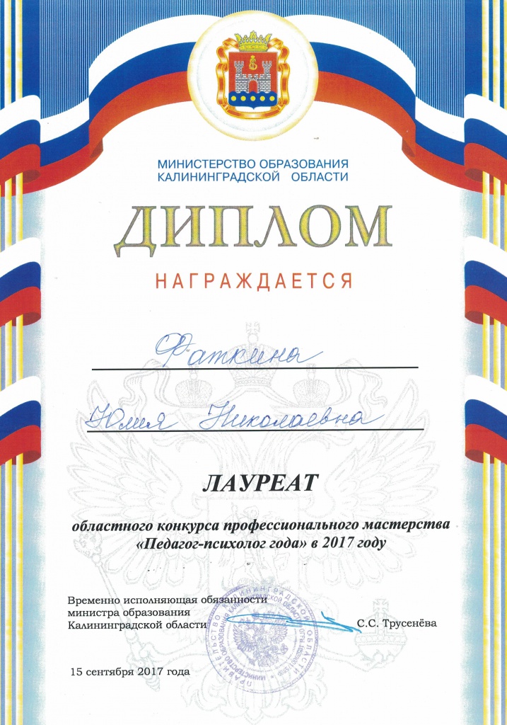 По итогам регионального конкурса «Педагог-психолог года» Юлия Фаткина была признана лауреатом (2-е место).