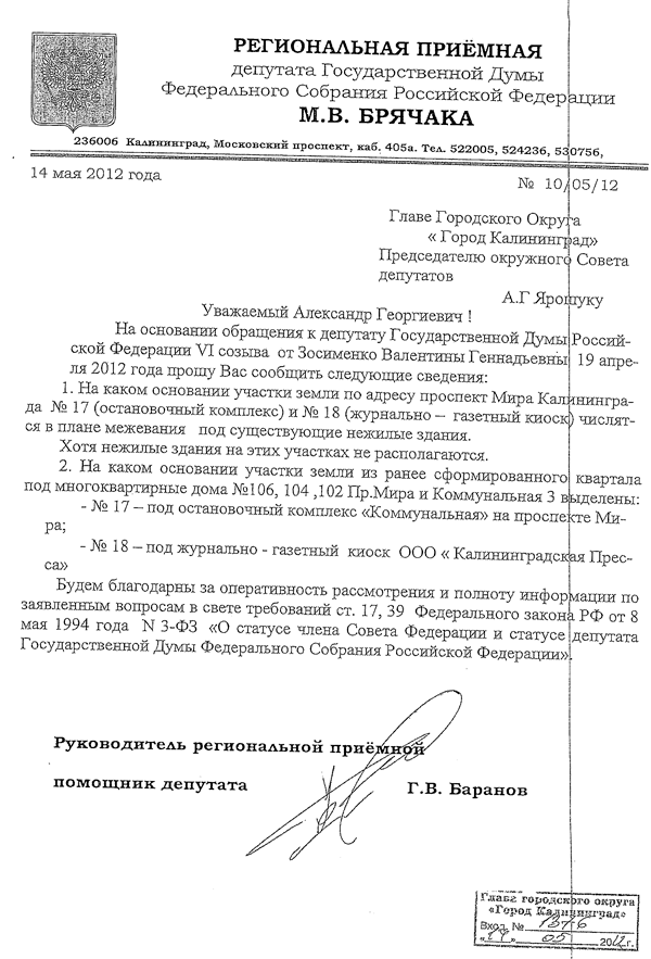 Таким образом, М. В. Брячеку был дан ответ от администрации Калининграда, согласованный Александром Ярошуком.