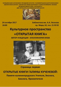 В рамках Года экологии первая страница «Открытой книги» посвящается миру книг Галины Георгиевны Кученёвой, блестящего учёного, дендролога, эколога, просветителя. Кандидат биологических наук, доцент, автор более 80 научных работ и свыше 500 научно-популярных очерков, публикаций, статей в российской и региональной прессе; член Ассоциации творческих педагогов России, ветеран восстановления Калининградской области. Награждена медалями «За доблестный труд во время Великой Отечественной войны», «50 лет победы в Великой Отечественной войне», «60 лет победы в Великой Отечественной войне», высшей педагогической наградой России — медалью им. К.Д. Ушинского, лауреат конкурса мэрии г. Калининграда «Человек-Событие-Время-2000» в номинации «Душа города», награждена многочисленными грамотами и благодарностями, инициатор создания Национального парка «Куршская коса».