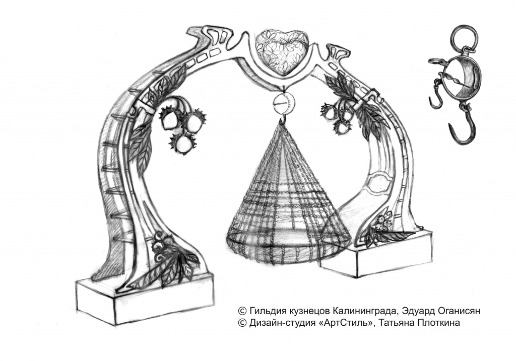 «По бокам конструкция украшена листьями и плодами каштана, символа города Калининграда. Фонари — это огромные коробочки каштана, лопнувшие от зрелости. Венчает конструкцию два объединившихся сердца – символы любви и единения. Сердца представляют собой каркасную конструкцию, оплетенную листьями каштана. При желании, есть возможность установить внутри красный, пульсирующий в ритме сердца, фонарь. Наверху в самом центре к конструкции подвешен безмен без противовеса. Ниже подвешена чаша весов в сети. Замки можно будет закрывать на сеть. При накоплении на сети большого количества замочков, их можно будет срезать. Срезанные замки попадут в чашу. При накоплении этого материала в дальнейшем можно будет изготовить какую-либо интересную скульптурную композицию для города», – пояснил Эдуард Оганесян.