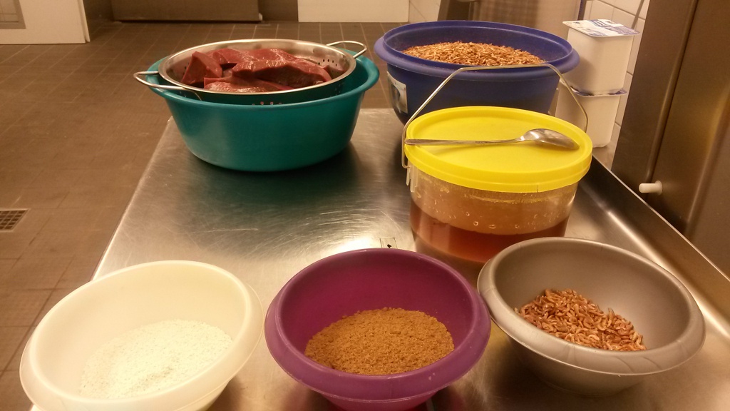 Питание муравьедов в Калининградском зоопарке максимально приблизят к тому, которое они получали до переезда. Рацион будет состоять из 26 ингредиентов: несколько видов сухих собачьих кормов супер-премиум класса исключительно чешского производства (животное привыкло именно к таким кормам, поэтому вместе с ним чешские коллеги привезли несколько кг. такого корма, постепенно муравьеда будут переводить на те корма, которые продаются в России), бананы, яблоки, сушеный гаммарус (рыбий витаминный корм), натуральный йогурт, свежие помидоры, геркулес, варёные яйца, постная вырезка говядины, мёд, чистейший просеянный торф (муравьедам необходима земляная фракция для правильного пищеварения), витаминно-минеральные добавки по сезону. Из этих продуктов будет готовиться гомогенная масса консистенцией напоминающая жидкую сметану (поскольку муравьеды не имеют зубов, пищу, выложенную в миску, они втягивают в рот с помощью длинного языка). Кроме того, в вольере муравьедов появятся специальные пеньки и кормушки с насекомыми, чтобы животные привычным им способом получали необходимый белок.