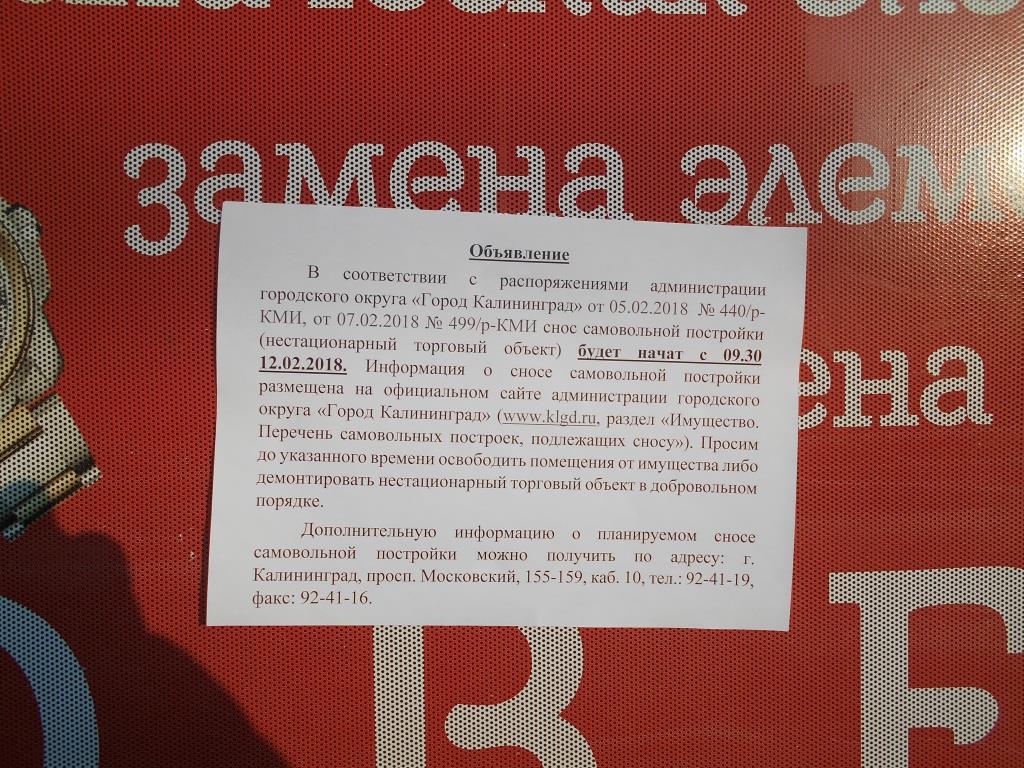 «В конце пошлого года все предприниматели, у которых 1 января закончился договор аренды, были предупреждены, что они обязаны демонтировать торговые павильоны, и что 12 февраля с 9.30 начнётся снос, - прокомментировал заместитель председателя комитета муниципального имущества и земельных ресурсов Сергей Румянцев. - Многие до этого времени самостоятельно демонтировали палатки. В 2016 году в Калининграде было демонтировано 179 нестационарных торговых объектов, из них 74 добровольно, 105 – принудительно. В 2017 демонтировано - 351, из них 123 принудительно, 228 – добровольно».