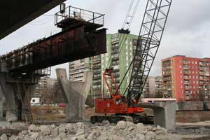 Бригадам бурильщиков ООО "Спецмост", которые готовят 30-метровые скважины под опоры моста, приходится работать в сложных условиях. На стройке используются финские мобильные буровые установки на гусеничном ходу. Грунт в этой части Калининграда перенасыщен водой, что создает дополнительные трудности. По строительным технологиям процесс сооружения моста идет круглосуточно. Одновременно ведется демонтаж устаревших конструкций недостроенного путепровода. Чтобы не беспокоить жителей ближайших домов, мостостроители сокращают объемы работ в ночное время до минимума. Во вторую смену на объекте остается полтора десятка специалистов из 120, работающих днем. К концу года основные работы на этой стройке, связанные с шумовым воздействием, прекратятся. А к лету в квартирах жилых домов на улице Генерала Павлова в зоне строительства эстакадного моста планируется установить шумопоглощающие стеклопакеты. На эти цели необходимо более 100 миллионов рублей. Их обещают выделить из федерального центра. Всего в близлежащих домах надо смонтировать две тысячи современных окон. Программа строительства эстакадного моста предусматривает его ввод в эксплуатацию в 2009 году. Он поможет разгрузить городской центр и перенаправить часть транспортного потока от улицы Дзержинского и проспекта Калинина на Московский проспект, улицы Фрунзе и Невского. По словам специалистов комитета строительства и транспорта мэрии, для строительства моста необходимо более семи тысяч тонн металла, 16 тысяч кубов монолитного железобетона, 21 километр буронабивных столбов и свай. А на гидроизоляцию, укладку защитного слоя и асфальтобетонного покрытия уйдет более 150 тысяч тонн долговечных строительных материалов.