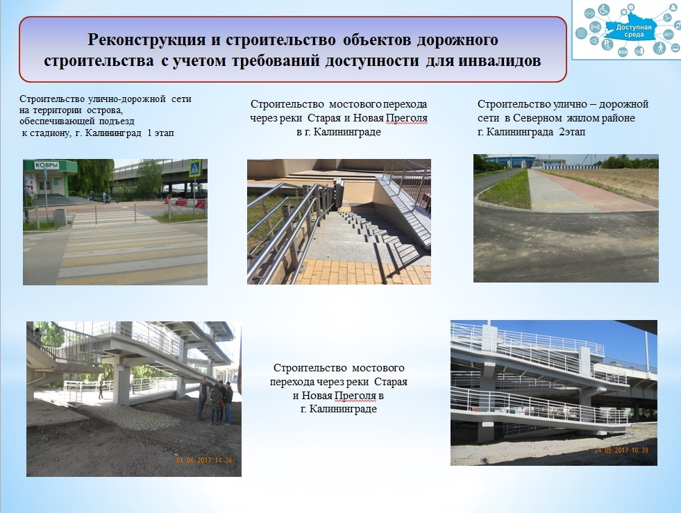Работы по реконструкции и строительству трёх объектов (мостовой переход через реки Старая и Новая Преголя, а также Высокий мост по ул. Октябрьской; строительство улично-дорожной сети в Северном жилом районе) выполнялись с учетом требований доступности для маломобильных групп населения (обустройство пандусами, понижение бортового камня и устройством тактильной плитки).