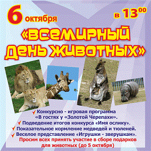 Мероприятие начнется в 13. 00 в выставочном зале административного корпуса. Всех гостей, маленьких и больших, ждет конкурсно-развлекательная программа «В гостях у Золотой Черепахи». Посетители узнают о самой известной международной фотовыставке дикой природы и смогут полюбоваться лучшими работами, представленными в конференц-зале зоопарка. По словам организаторов, очень внимательные и любопытные слушатели получат призы. В этот же день в конференц-зале откроется выставка детского творчества, приуроченная к «Всемирному дню защиты животных». Какое имя получит малыш-ослик, станет известно в 13.20, и автор этого имени получит незабываемый приз. Кстати, подарки получат и другие участники акции «Я дарую тебе имя». С 13. 30 ростовые куклы проведут для гостей зоопарка показательные кормления медведей и тюленей. По традиции работники зоопарка расскажут увлекательные истории из жизни животных. Веселая компания «Смайлик» предложит всем принять участие в развлекательной программе «Игрушки - зверушкам».