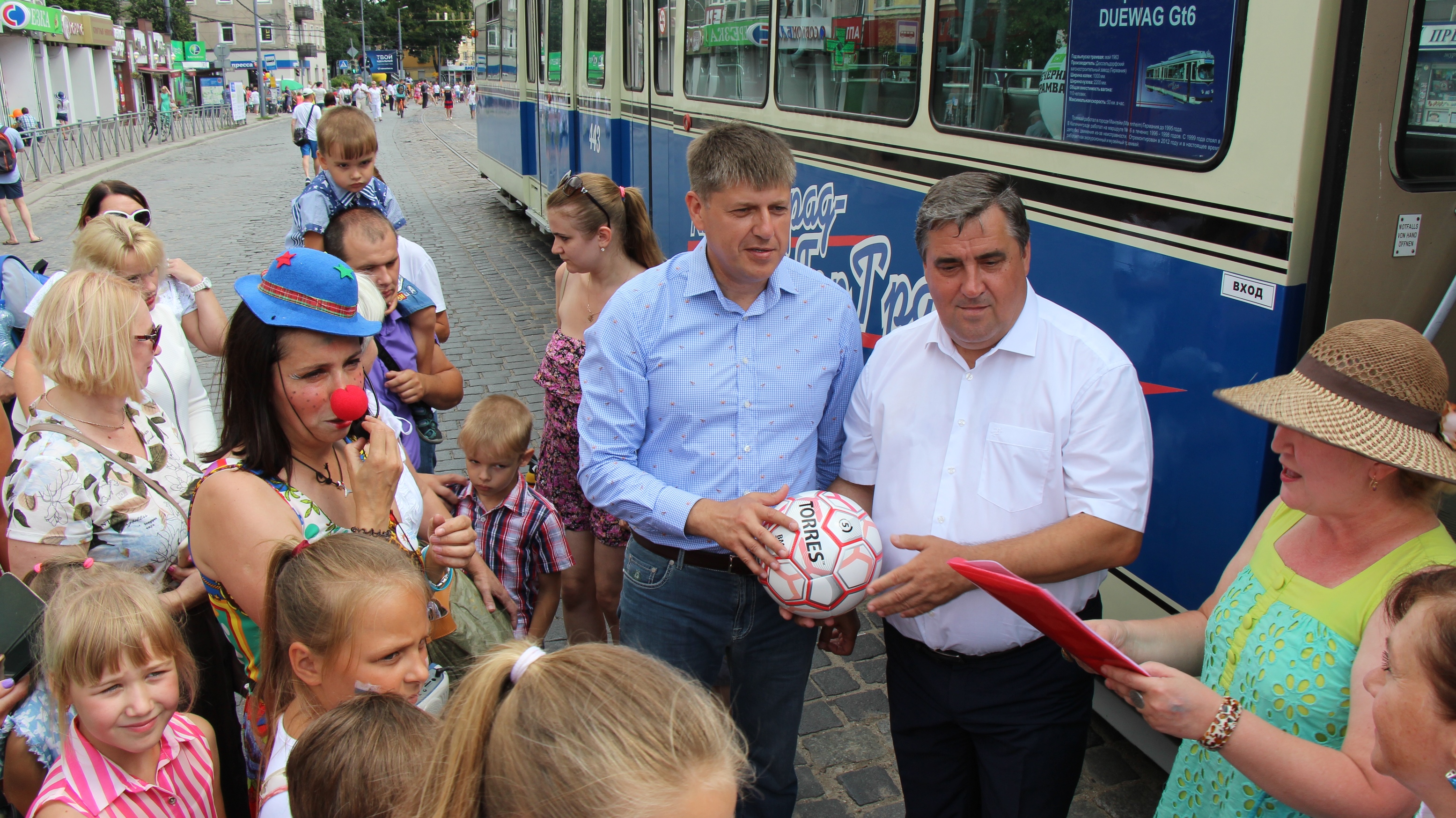 Затем Алексей Силанов и Андрей Кропоткин приняли участие в благотворительной акции. Здесь, возле ретро-трамвая «Дюваг», на время занявшего место на проспекте Мира, исполнились желания 16 ребят из многодетных семей Калининграда. Трое ребят рассказали газете «Вечерний трамвай», что мечтают о футбольных мячах. Это12-летний Максим Урбан, 9-летний Сергей Коновалов и 15-летний Артем Антипин. Остальные ребята попросили подарить им на день рождения города настольные игры, рюкзаки, краски и школьные принадлежности.