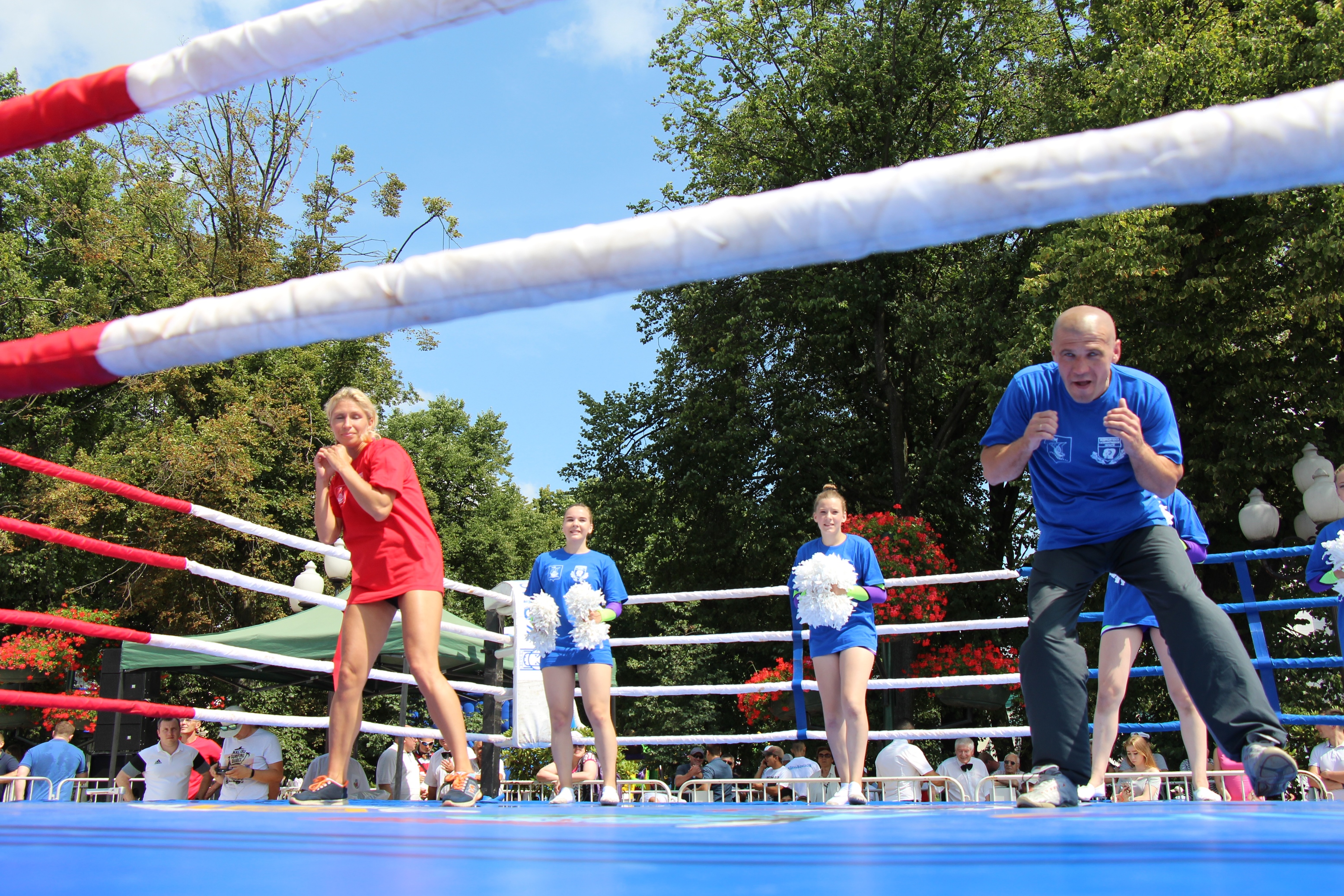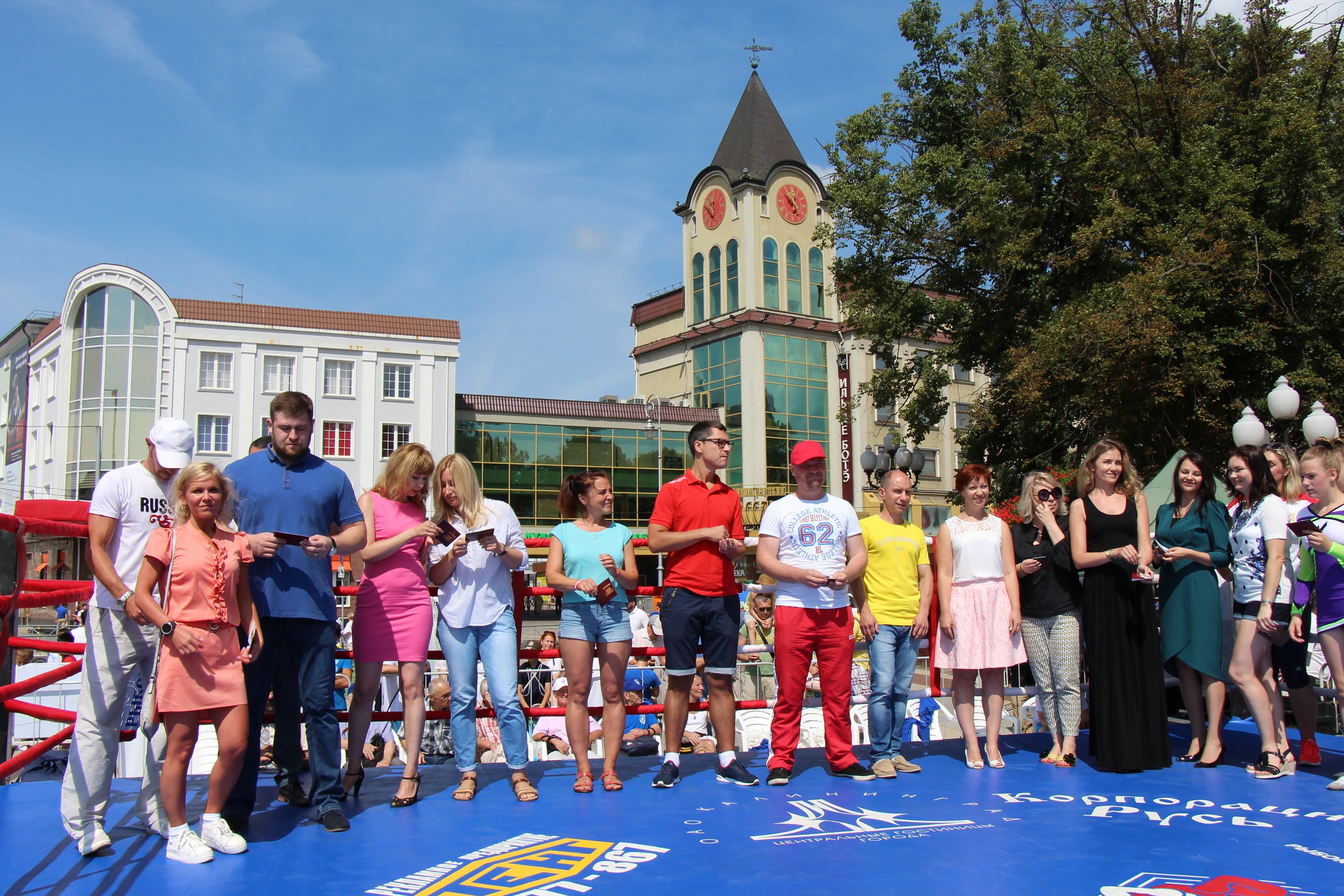 Вокруг ринга, установленного прямо на главной площади Калининграда, собрались несколько сотен зрителей самых разных возрастов, гости нашего города, действующие спортсмены и физкультурники, а также ветераны спорта.