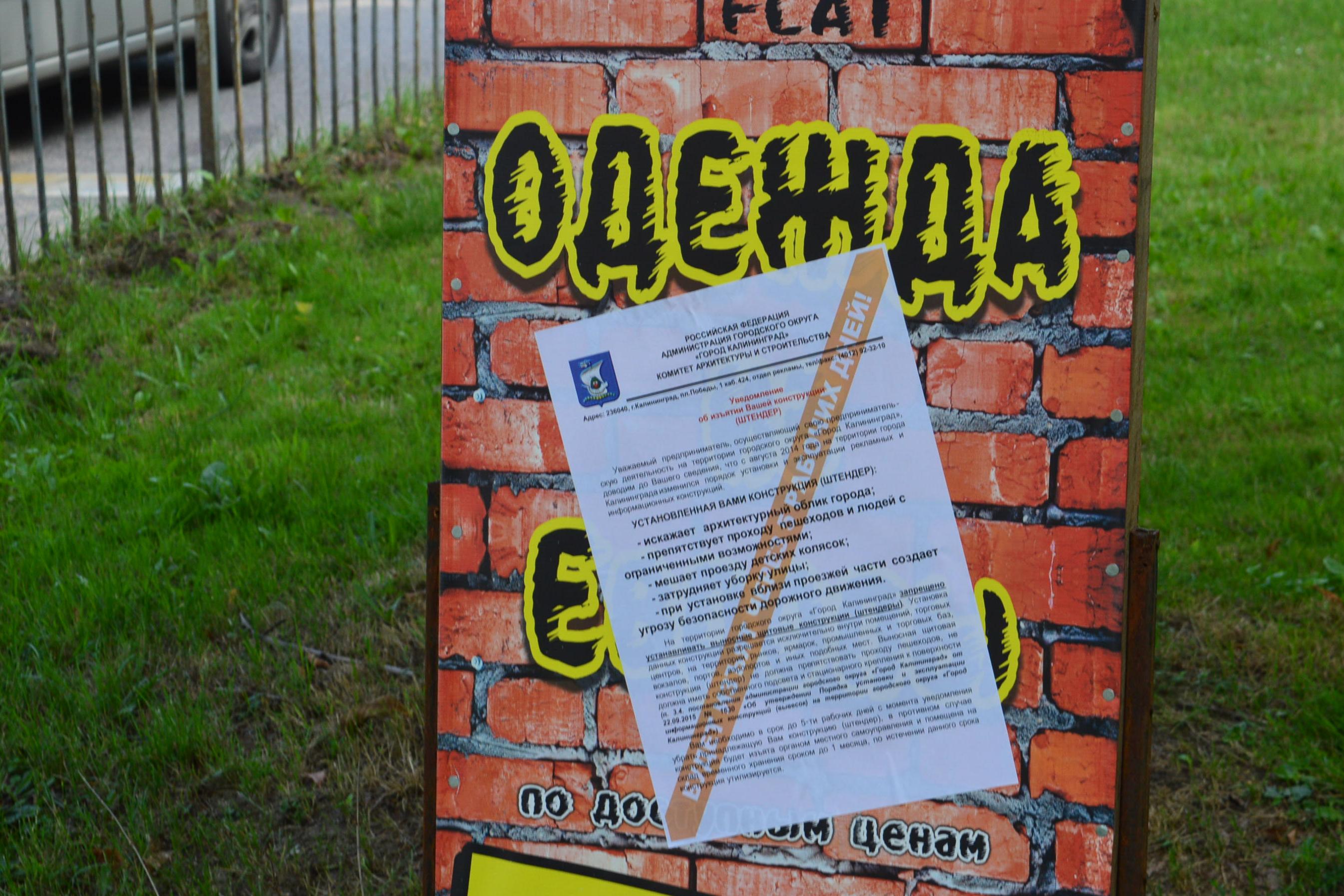 «Это превентивная мера. Такое уведомление не влечет какого-либо наказания, оно лишь носит уведомительный и разъяснительный характер, является предупреждением. Уведомление дает возможность устранить выявленное нарушение до принятия мер административного воздействия. С сентября 2015 года на территории Калининграда запрещено устанавливать штендеры. Сотрудники отдела рекламы регулярно в ходе выездных мероприятий выявляют такие выносные конструкции. На них приклеивается уведомление-стикер, в котором указан запрет на установку штендеров и необходимость демонтажа данной конструкции в течение 5-ти рабочих дней. Если штендеры в указанный срок не убраны их владельцами, они изымаются представителями органа местного самоуправления», – сообщил Артур Крупин.