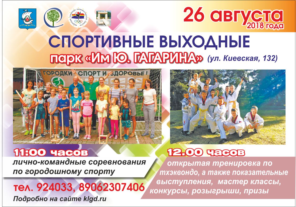 26 августа 2018 года в парке им. Ю. Гагарина (ул. Киевская, 132) в рамках проекта «Спортивные выходные» в 11.00 начнутся лично-командные соревнования по городошному спорту, а в 12.00 стартует открытая тренировка по тхэквондо.