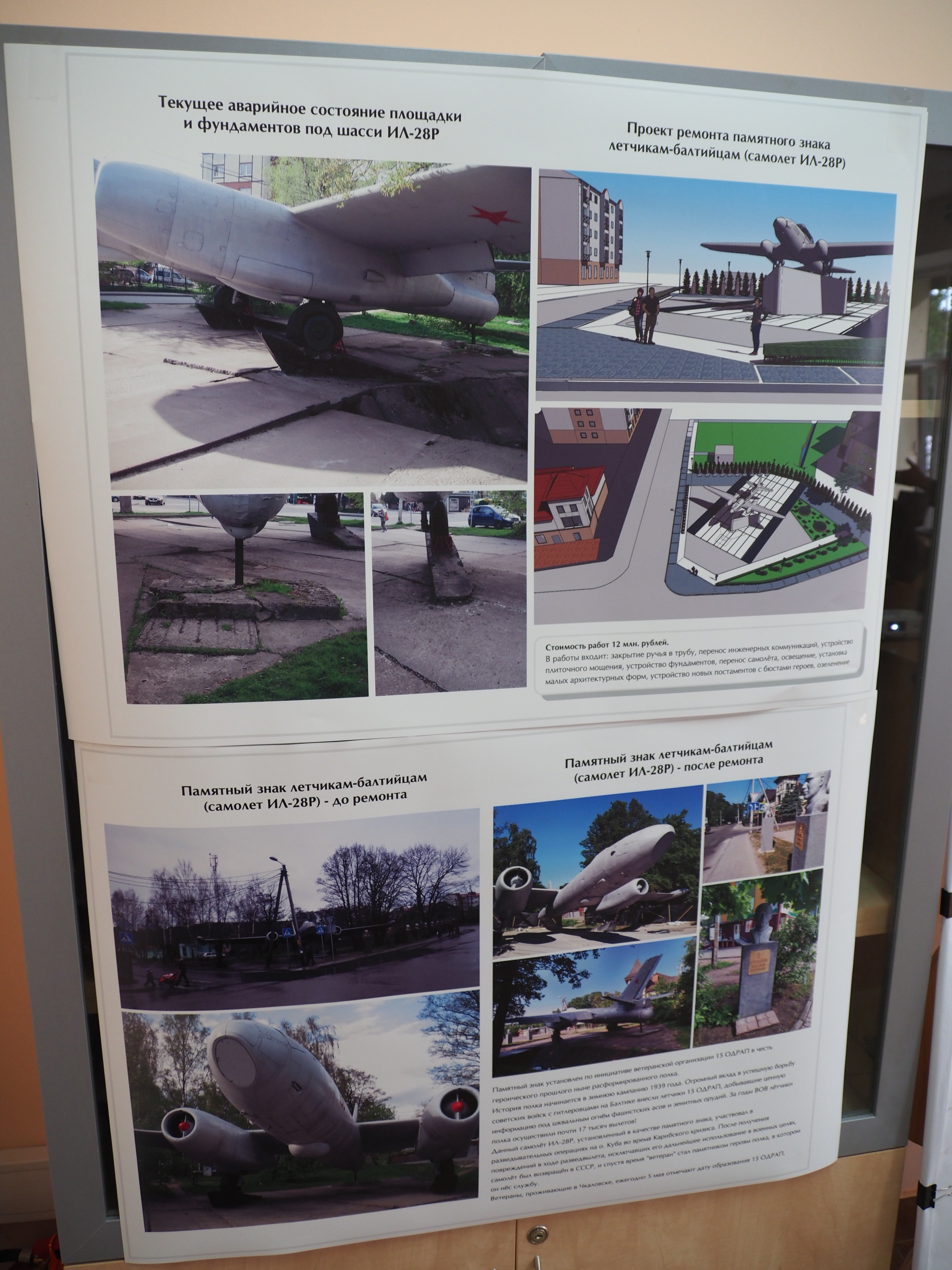 Ещё один важный вопрос, требующий решения – аварийное состояние и фундамент под шасси памятного знака летчикам-балтийцам (самолета ИЛ-28Р). По проекту предполагается благоустройство территории и укрепление фундамента, создание новых бюстов, ремонт памятного знака, перенос инженерных коммуникаций и установка освещения. Оценочная стоимость – 12 млн рублей.