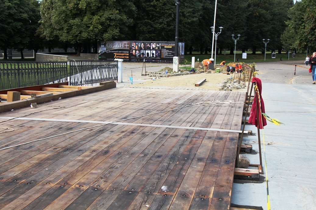 На подходах к мосту укладывают брусчатку, а на самом мосту обустраивают настил из лиственницы.