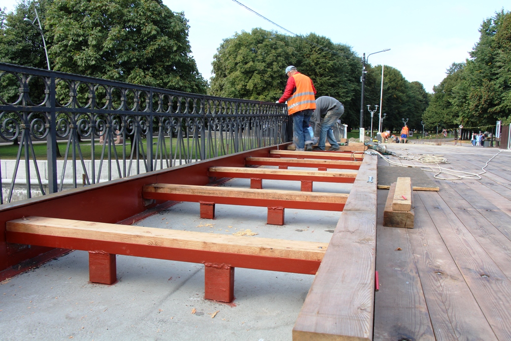 На проезжей части начали укладывать новый деревянный настил из бруса лиственницы, обработанной специальной пропиткой. На тротуарах также будет деревянный настил. Ограждения на мосту не меняли. Проектом предусмотрели выправку поврежденных секций существующего ограждения, его пескоструйную очистку и нанесение защитного покрытия.