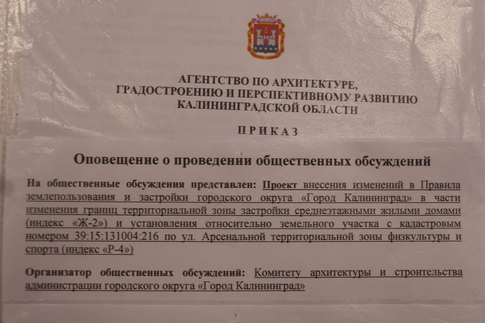 1) Проект внесения изменений в Правила землепользования и застройки городского округа «Город Калининград» в части изменения границ территориальной зоны застройки среднеэтажными жилыми домами (индекс «Ж-2») и установления относительно земельного участка с кадастровым номером 39:15:131004:216 по ул. Арсенальной территориальной зоны физкультуры и спорта (индекс «Р-4»).