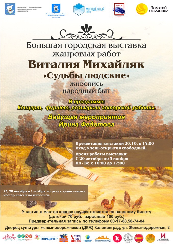 20 октября в 14.00 в Доме культуры железнодорожников пройдёт большая городская выставка художника Виталия Михайляка, организованная при поддержке управления спорта и молодежной политики комитета по социальной политике администрации Калининграда.