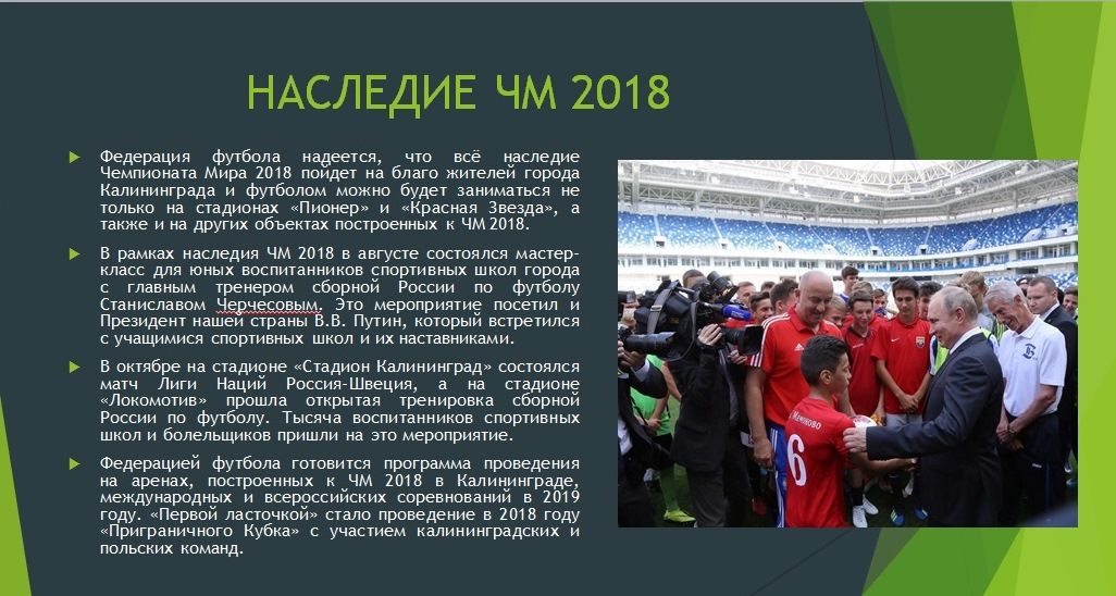 Уже после Чемпионата мира, в августе, состоялся мастер-класс для юных воспитанников спортивных школ города с главным тренером сборой России по футболу Станиславом Черчесовым. Это мероприятие посетил и Президент Российской Федерации Владимир Путин.
