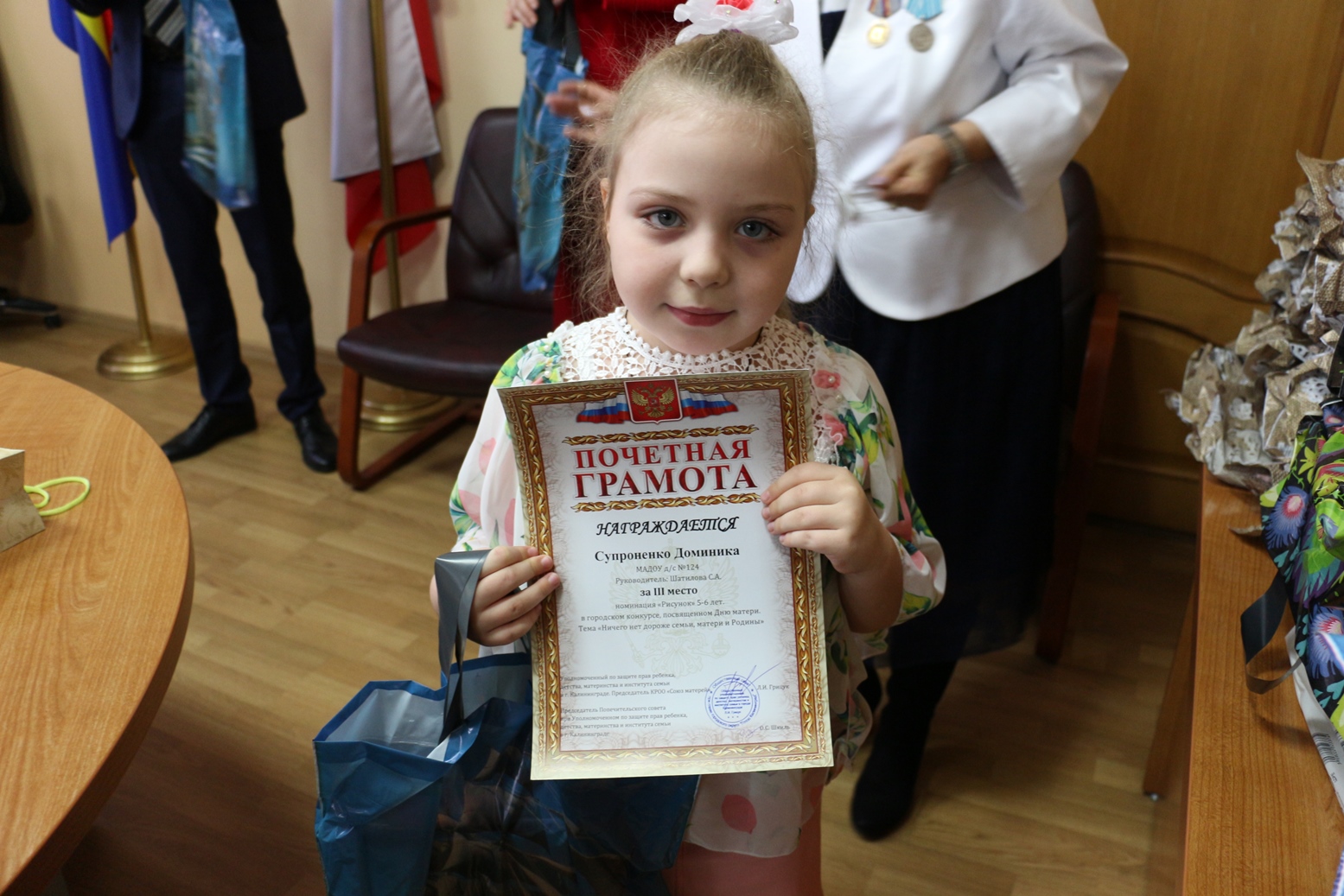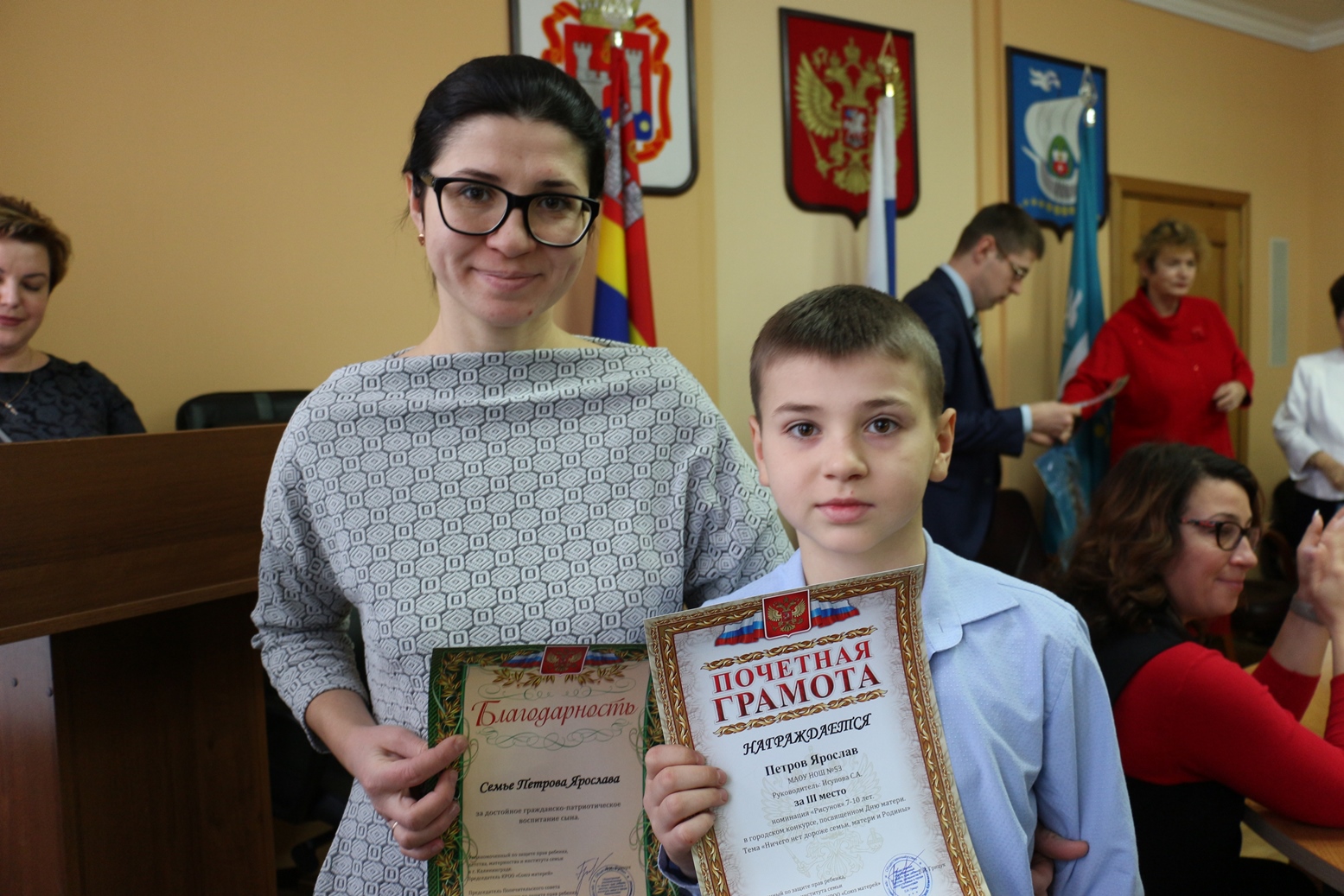 В канун Дня матери конкурсанты были приглашены в администрацию Калининграда для вручения почетных грамот от КРОО «Союз Матерей» и ценных подарков. Благодарностей также были удостоены их мамы.