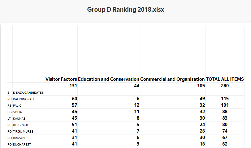 Он выделяет три позиции: «Посетительский фактор» - удобство и комфорт посетителей, «Просвещение и природоохранная работа», «Коммерческая деятельность и организация процессов» - финансовая успешность, количество сотрудников, их профессиональная квалификация, эффективность построения рабочего процесса и т.п. По всем трём пунктам Калининградский зоопарк набрал 115 баллов из 280 возможных. Для сравнения, зоопарк г. Палич (Сербия), занявший второе место, набрал 101 балл.