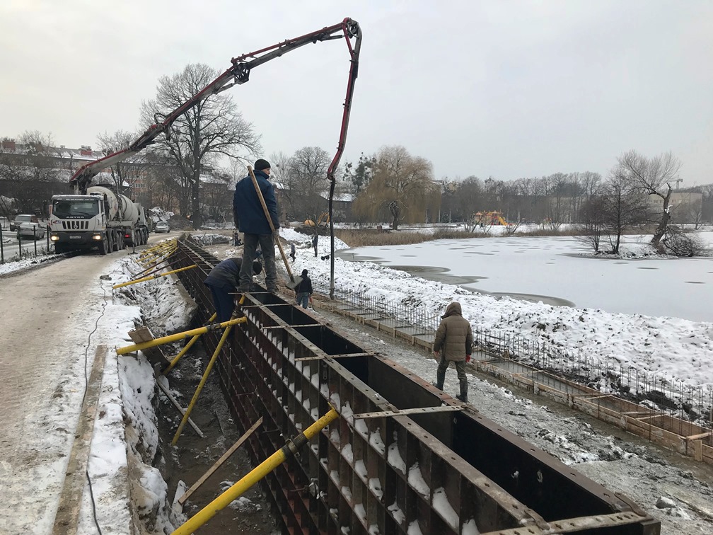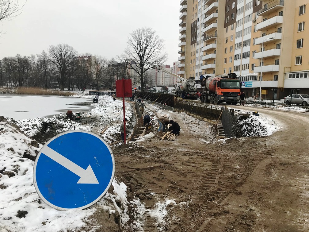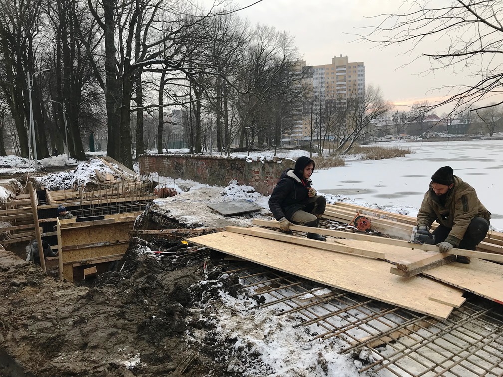 Представитель подрядчика доложил, что к предстоящим новогодним каникулам на набережной и в амфитеатре, а также на дамбе и трубопереезде будет залито бетонное основание, и по нему можно будет ходить. Все пешеходные дорожки замкнут вокруг озера, и у калининградцев появится возможность прогуляться по ним.