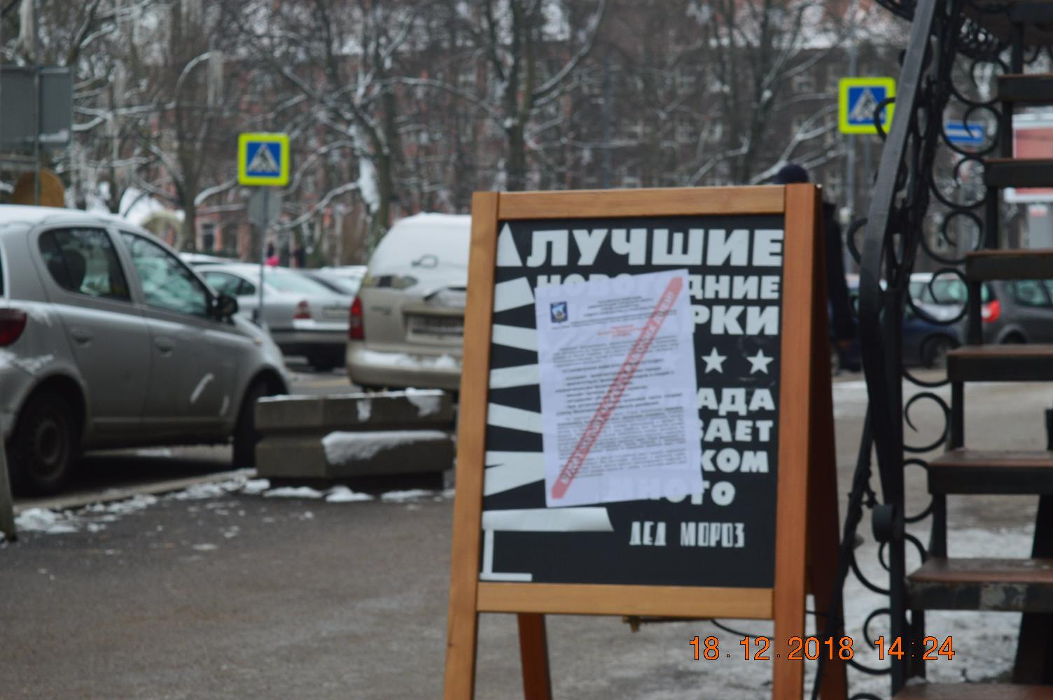 С 2015 года в Калининграде на территориях общего пользования запрещено использование штендеров, поскольку они мешают свободному перемещению людей по тротуарам и в целом созданию безбарьерной городской среды. Сотрудниками отдела рекламы регулярно в ходе выездных мероприятий выявляются такие выносные конструкции. На них приклеивается уведомление-стикер, в котором указаны запрет на установку штендеров и необходимость демонтажа данной конструкции в течение 5-ти рабочих дней. Такие же стикеры клеятся на настенные панно, которые также запрещены в нашем городе. В ходе минувшей недели нанесено 23 стикера-уведомления о недопустимости нарушения законодательства в сфере рекламы и благоустройства на вышеназванные конструкции.