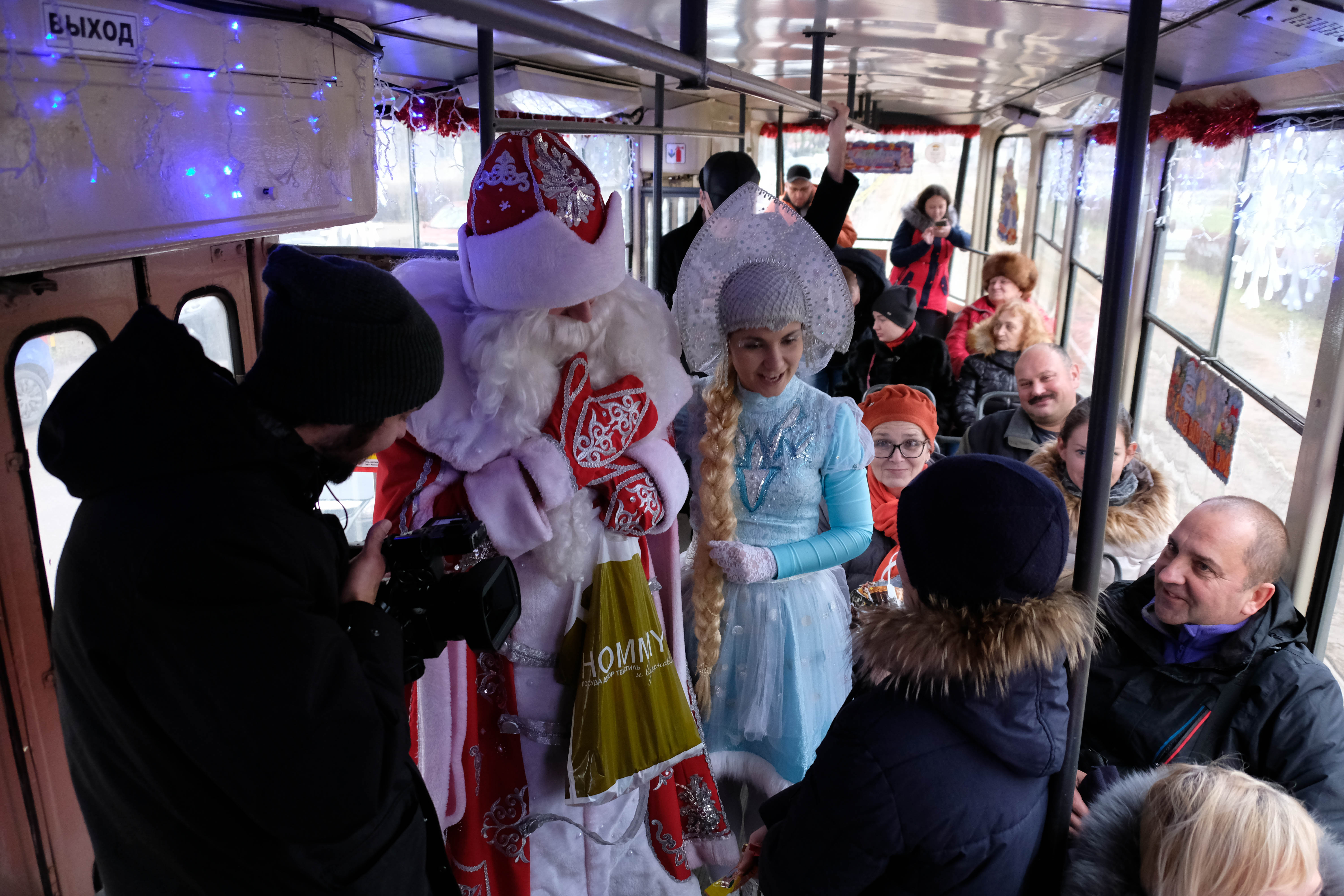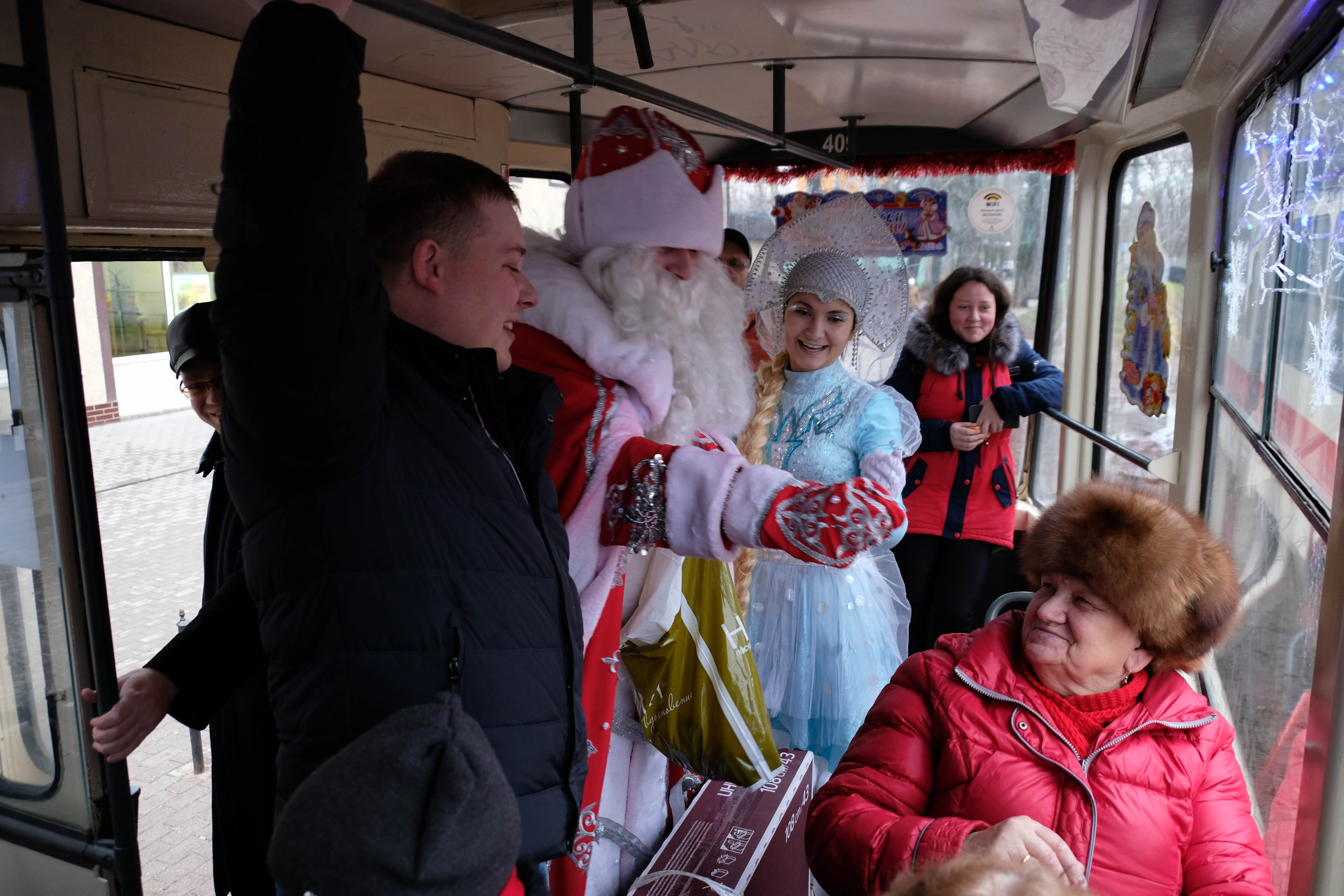 Традиционные подарки – сладости и мандарины, порадовали и ребятишек, и взрослых. Но главное – это помогло маленьким пассажирам по-настоящему поверить в то, что в новогодние дни происходят чудеса, и что Дед Мороз и Снегурочка запросто гуляют по улицам, ездят не только на санях, на оленьей упряжке, но и в автобусах и трамваях, украшенных к празднику.
