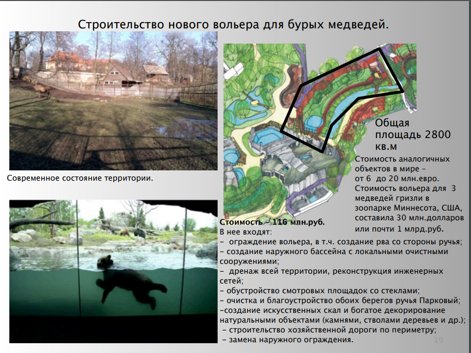 В рамках инфраструктурной части проект предполагает ревитализацию территории Калининградского зоопарка в районе улиц Шота Руставели-Брамса-Носова (всего около 1 га) вдоль ручья Парковый. В рамках проекта будет выполнен детальный мастер-план этой части зоопарка, спроектирован "под ключ" новый вольер для бурых медведей, восстановлено ограждение и проведено благоустройство территории.