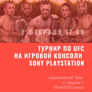 2 февраля в 17:00 в молодежном клубе «Джем» (ул. Заводская, 5) пройдет турнир EA Sports UFC на игровой консоли Sony PlayStation. Турнир проводится по олимпийской системе на вылет, где каждый имеет возможность стать чемпионом октагона.