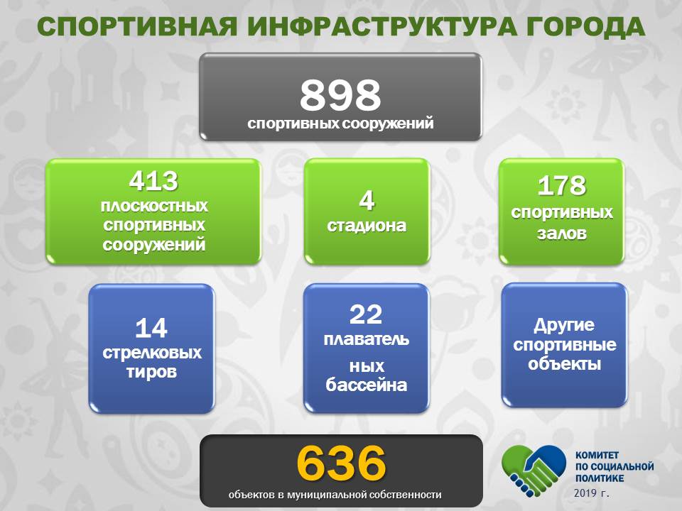 В городе создана спортивная инфраструктура: 898 спортивных сооружений. В том числе 413 плоскостных спортивных сооружений, 4 стадиона, 178 спортивных залов, 14 стрелковых тиров, 22 плавательных бассейна и 267 других спортивных объектов. В муниципальной собственности находится 636 спортивных объектов.
