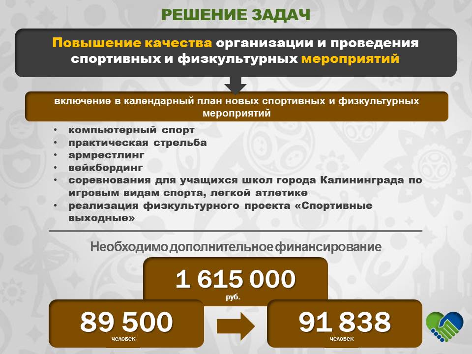 Численность калининградцев, систематически занимающихся физкультурой и спортом, составляет 151 452 человека (31,5%), в спортивных праздниках и состязаниях приняли участие более 89 500 человек.