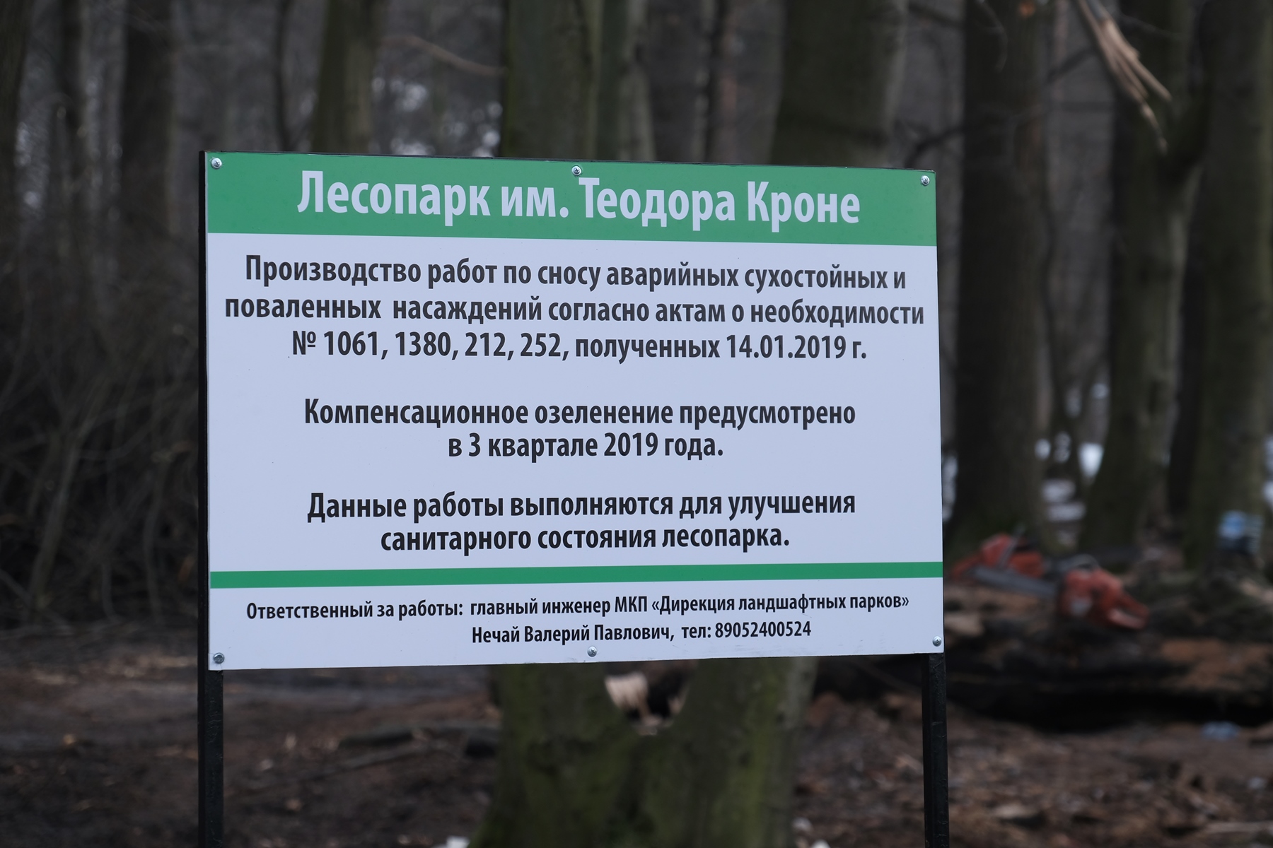 Работы в парке Теодора Кроне ведутся на основании актов №№ 1061, 1380, 212, 252 от 14.01.2019, информация об этом размещена на специальной табличке у входа в парк.