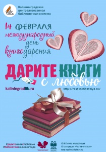 С 13 по 17 февраля 2019 года библиотеки МАУК «Калининградская ЦБС» примут участие в Третьей общероссийской акции «Дарите книги с любовью», приуроченной к Международному дню книгодарения, который отмечается уже несколько лет 14 февраля во многих странах мира. Библиотекари приглашают присоединиться к акции и дарить друг другу не только «валентинки», но и хорошие книги, ведь книга остается актуальным подарком и не теряет своей ценности даже в век технологий.