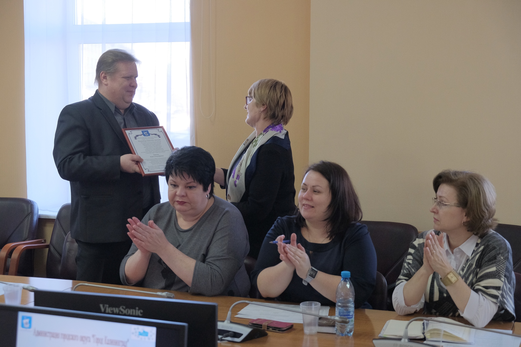 За активное участие в формировании доступной городской среды благодарственные письма председателя комитета по социальной политике были вручены Роману Аранину, председателю Калининградской региональной общественной организации инвалидов «Ковчег»; Игорю Бирилову Александрович, председателю Калининградской городской местной организации Всероссийского общества слепых; Дине Гуреевой, председателю Калининградского регионального отделения Всероссийского общества глухих; Сергею Киселеву, председателю Калининградского регионального отделения Общероссийской общественной организации инвалидов «Ассоциация молодых инвалидов России «Аппарель».