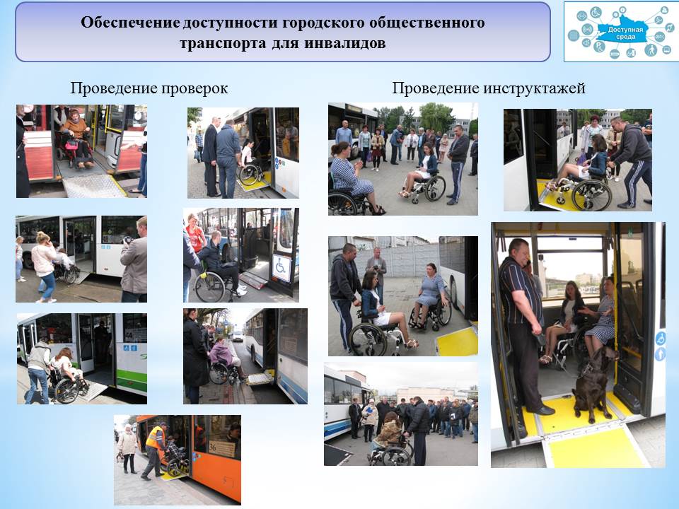 Совместно с общественными организациями инвалидов было организовано обследование гостиниц, рекомендованных FIFA к ЧМ-2018 на предмет доступности для инвалидов и других маломобильных групп населения; мониторинг дворовых территорий в рамках проведения работ по их благоустройству; проведение проверок обеспечения водителями автобусов и троллейбусов возможности посадки в транспортное средство инвалидов-колясочников и высадки из него; проведение на базе автотранспортных предприятий инструктажей линейных составов транспортных средств по вопросам оказания содействия инвалидам в посадке (высадке) в транспортное средство, а также этике общения с инвалидами.